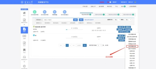 4. 进入项目组成员,请确认成员是否完整。特别是项目中有学生的参与的,请完善学生身份类别。成员信息有问题的,进入科研系统成人文学,左侧的项目界面,点击操作下拉框下的成员调整申请,进入成员调整界面进行添加和修改,待项目主管审核之后,会自动补充到项目经费公开一览表,最后再提交即可。