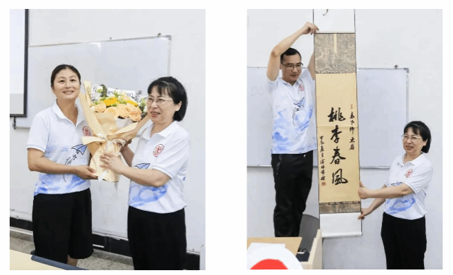 学生代表为裘琴儿献上了校友们精心准备的鲜花和书法作品,表达了学生对老师的感恩之情。曾大雁、倪云两位同学为大家送上了“神秘礼物”,表达了同窗友谊长存之意。