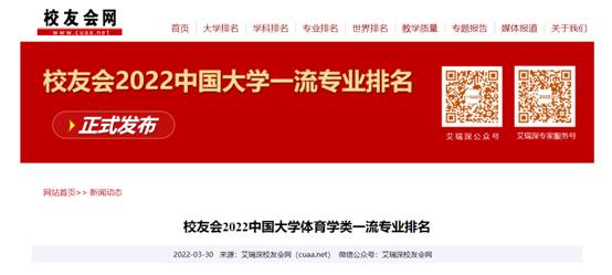 2022年3月30日,据全国第三方大学评价机构艾瑞深校友会网(Cuaa.Net)最新发布的校友会2022中国大学一流专业排名、2022中国大学各专业类一流专业排名榜单,成人文学 体育教育专业获评A+,在“体育教育专业排名(研究型)”中排名前列。