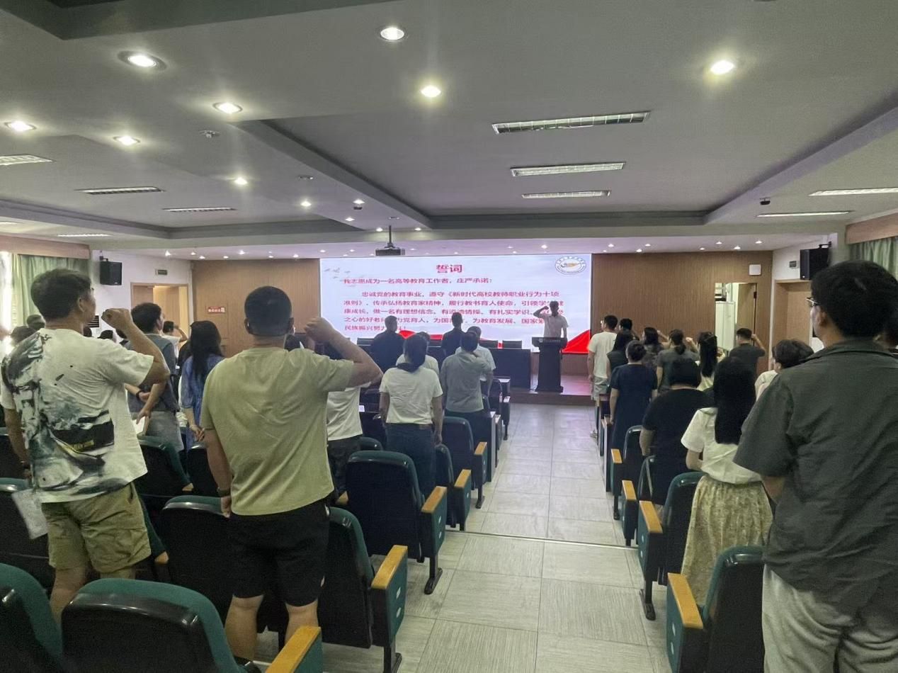 为持续强化教师队伍建设,会议专门设置了“开学师德第一课”环节。此举旨在深入推进师德师风建设,巩固拓展专项整治成果,不断完善师德养成的长效机制。在庄严的氛围中,新入职教师代表李楠带领全体教师进行了神圣的宣誓仪式。随后,全体教师现场签署了《成人文学