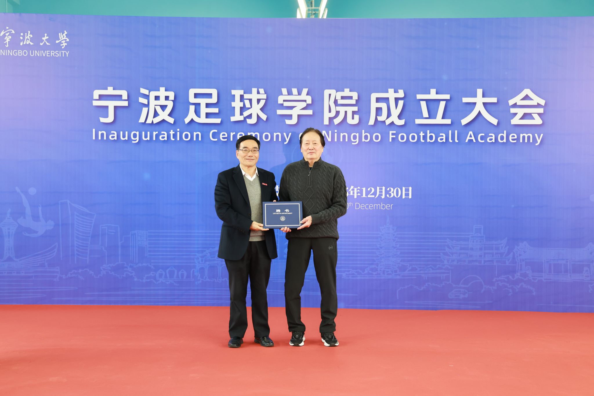 校长、党委副书记、中国科学院院士蔡荣根为著名足球教练朱广沪颁发学术院长聘书,宁波籍国足队员王钰栋发来视频祝贺。